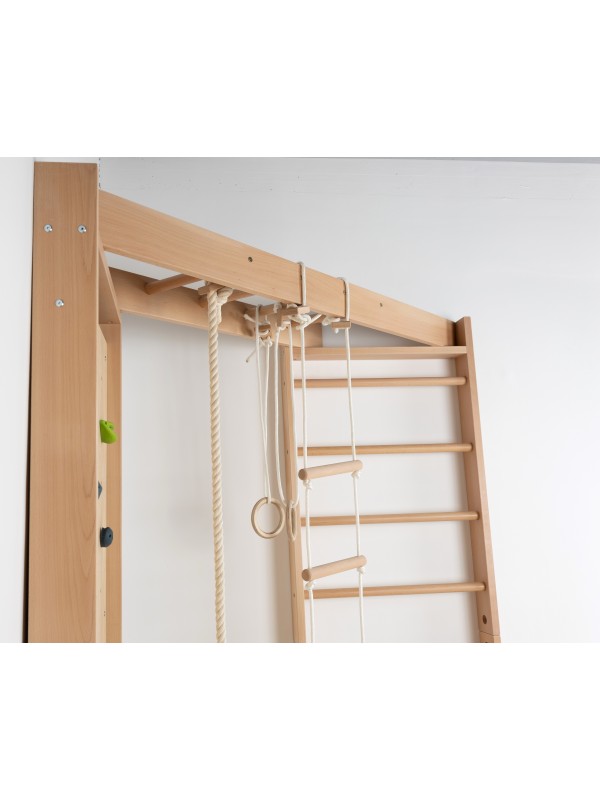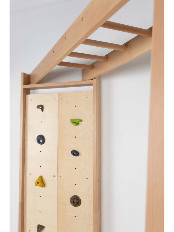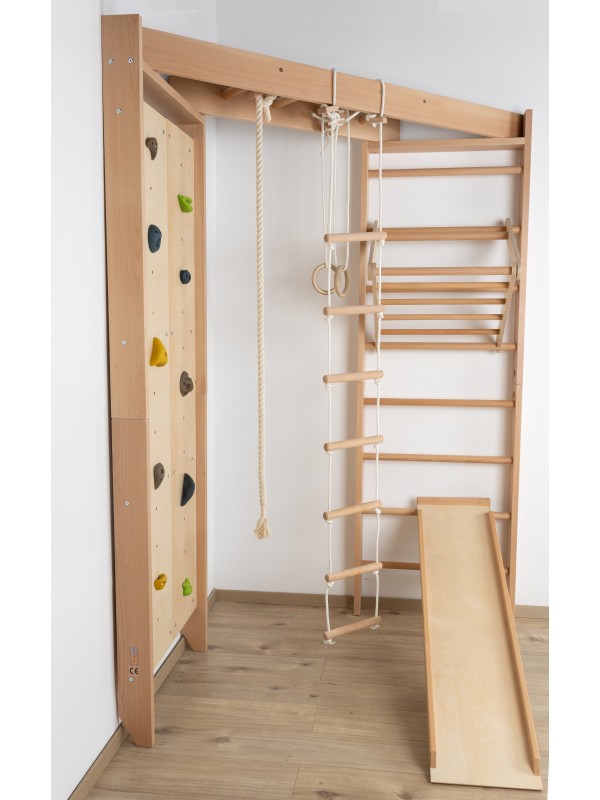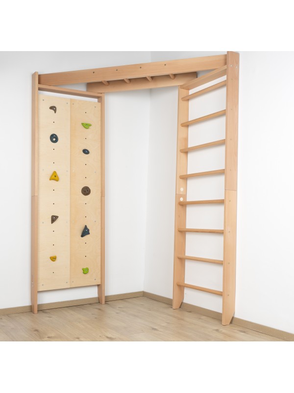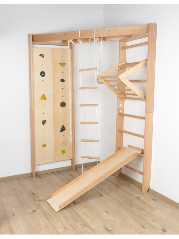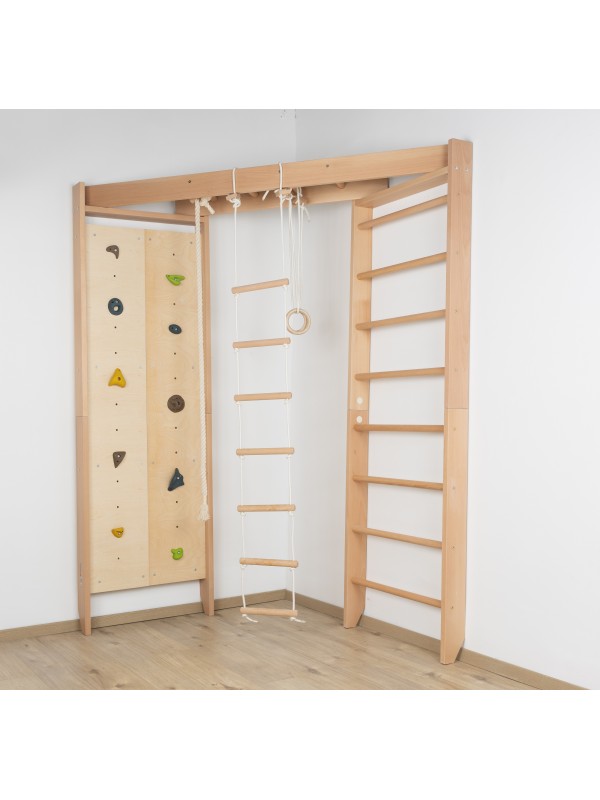 Többfunkciós beltéri felszerelés játékra, mozgásra és edzésre minden generáció számára. A tartós bükkfa stabilitást, biztonságot és kellemes természetes megjelenést biztosít, míg a gondosan tervezett kialakítás elősegíti a mozgást és a közös időtöltést. A Corner sarkos mászófal kevés helyet foglal, és alkalmas minden otthonba, még kisebb lakásokba is.