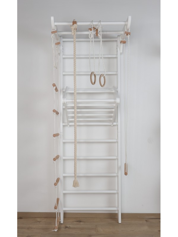 Fehér falépcső kiegészítőkkel – tökéletes otthoni edzőeszköz az egész család számára! Kompakt, többfunkciós kialakítás, amely a gyerekek és felnőttek aktív mozgását egyaránt támogatja. Európában készült, kiváló minőségű bükkfából, HIDROHEL gyermekbarát festékkel fehér színben, amely tökéletesen illeszkedik minden belső térhez.