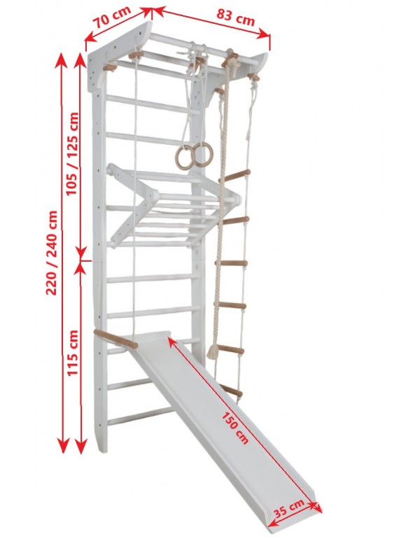 - Teherbírás: Svéd létra: 150 kg, Fix felső rúd: 100 kg, Levehető gyermek rúd: 50 kg, Függő kiegészítők: 60 kg