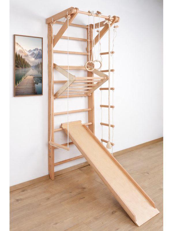 - Komponensek: falra szerelhető létra (biztonsági tanúsítvány: SIST EN 1176-1:2008), fix felső rúd, kötél, gyűrűk, mászólétra, hinta, csúszda, levehető gyerek háromszög rúd