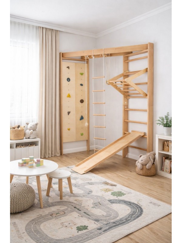 Többfunkciós beltéri felszerelés játékra, mozgásra és edzésre minden generáció számára. A tartós bükkfa stabilitást, biztonságot és kellemes természetes megjelenést biztosít, míg a gondosan tervezett kialakítás elősegíti a mozgást és a közös időtöltést. A Corner sarkos mászófal kevés helyet foglal, és alkalmas minden otthonba, még kisebb lakásokba is.